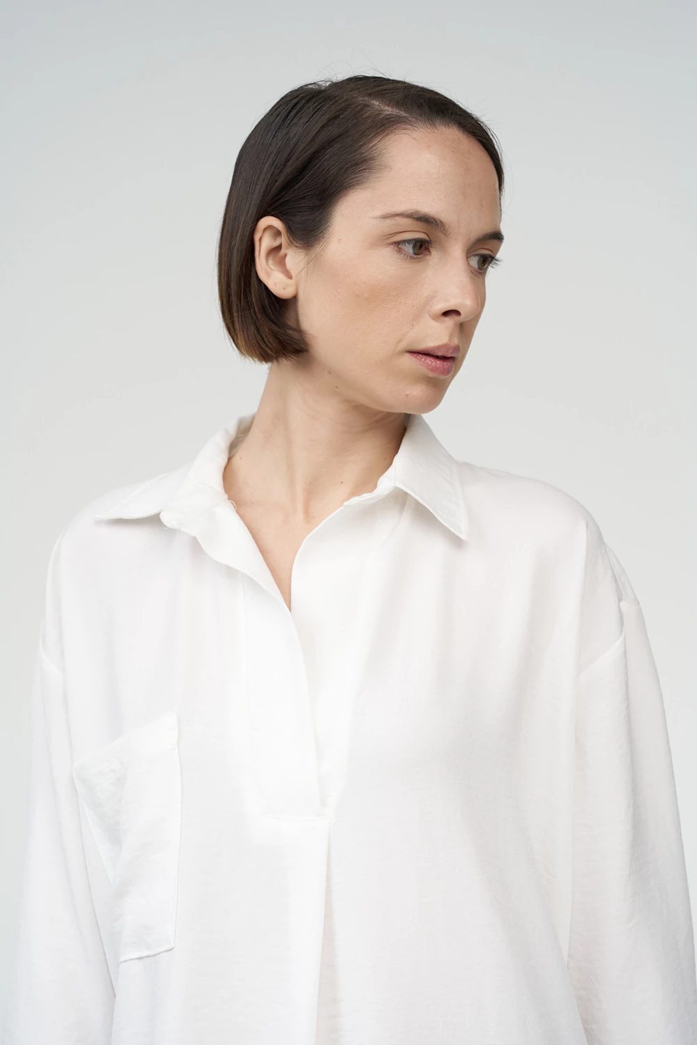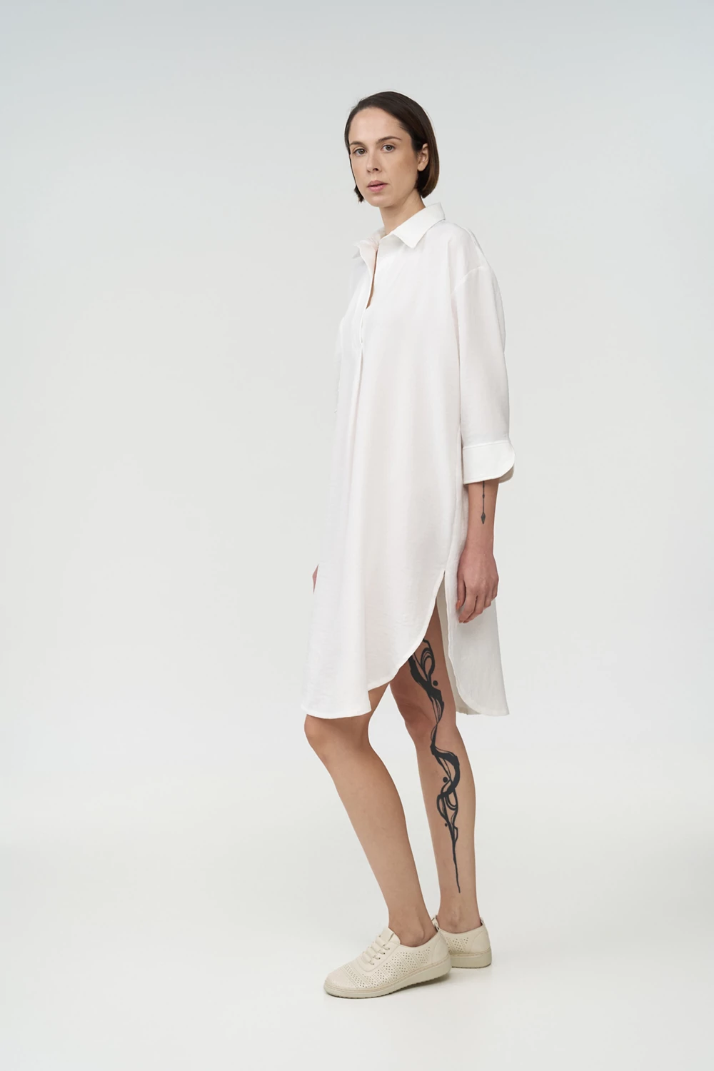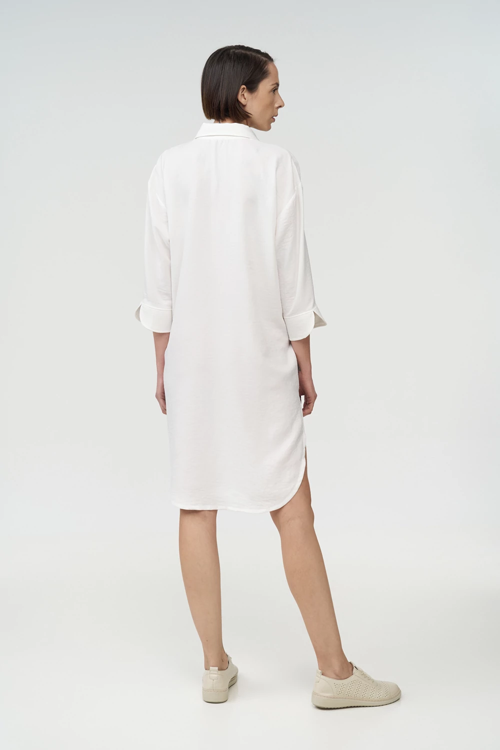 Το 3/4 μανίκι με απερτούρα προσφέρει άνεση και μοντέρνο χαρακτήρα, ενώ το ασύμμετρο μήκος — κοντύτερο μπροστά και μακρύτερο πίσω — δημιουργεί κολακευτική γραμμή που αναδεικνύει τη σιλουέτα. Ιδανική για resort wear, hotel boutiques και beach bars, συνδυάζει κομψό design, άνεση και διαχρονικό στυλ.