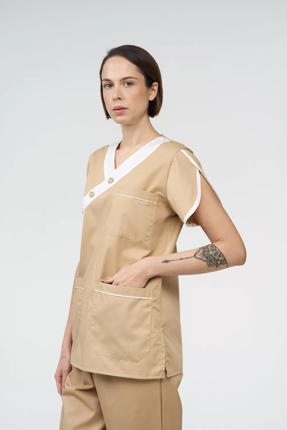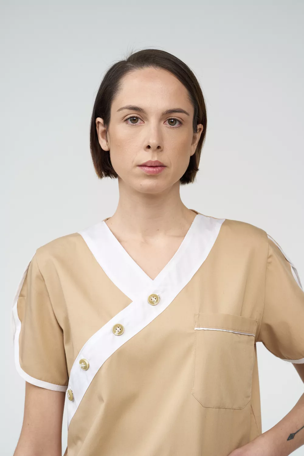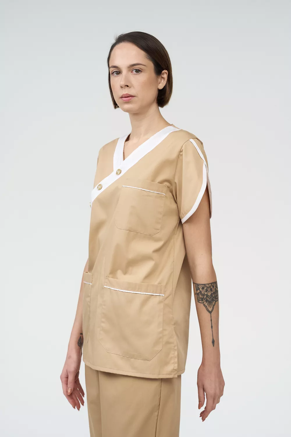 Μπλούζα με split sleeve μανίκια για να δίνει κίνηση στα χέρια και κλειστό στο κάτω μέρος, ώστε να μην φαίνεται η μασχάλη. Διαθέτει τρεις μεγάλες, χρηστικές τσέπες. Συνδυάζεται με παντελόνι με ελαστική μέση και ρυθμιζόμενο κορδόνι για να καλύπτει αρκετούς σωματότυπους.