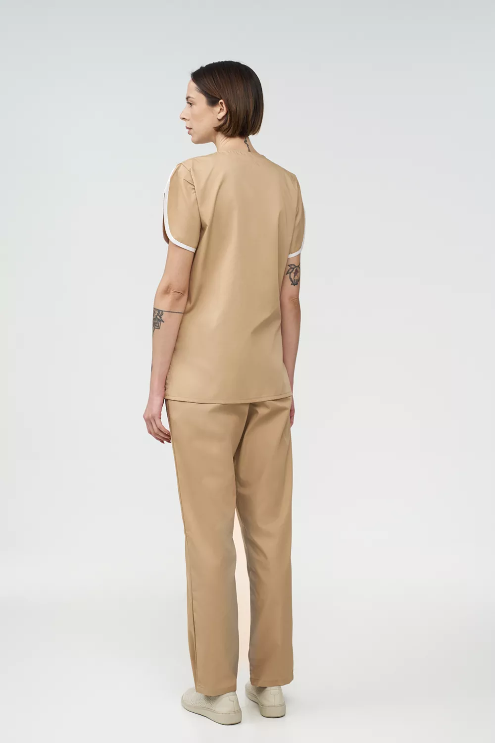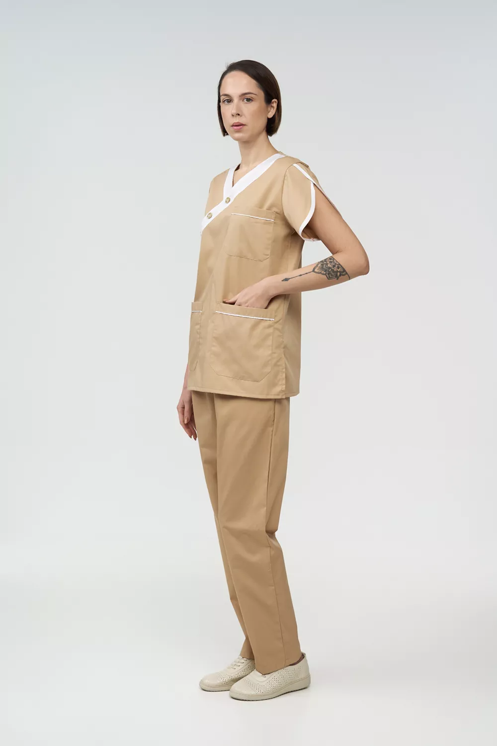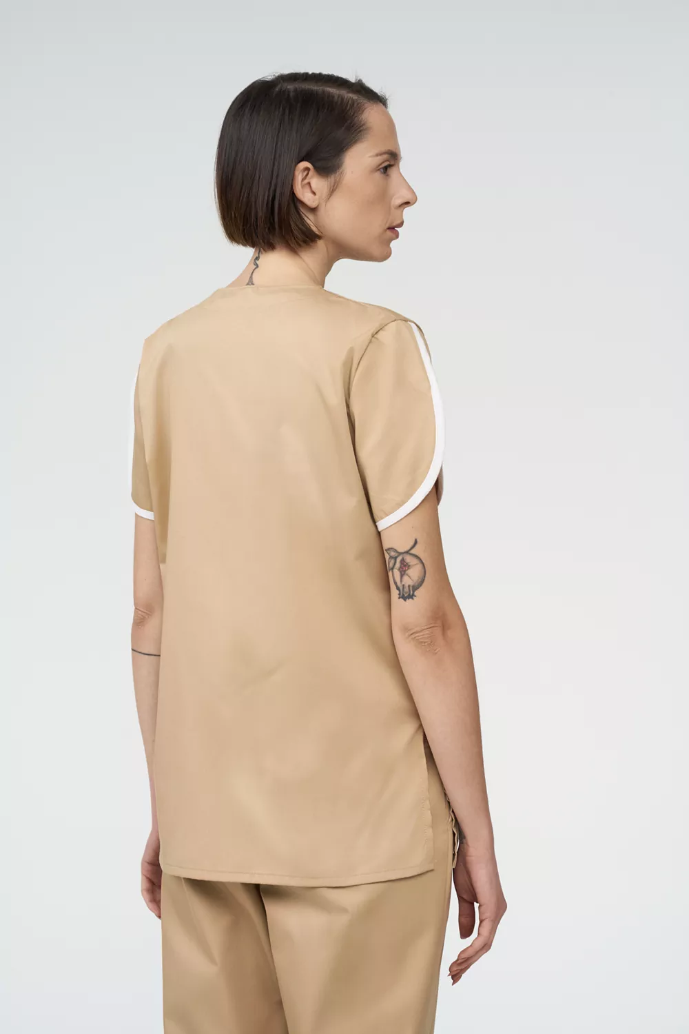 Μπλούζα με split sleeve μανίκια για να δίνει κίνηση στα χέρια και κλειστό στο κάτω μέρος, ώστε να μην φαίνεται η μασχάλη. Διαθέτει τρεις μεγάλες, χρηστικές τσέπες. Συνδυάζεται με παντελόνι με ελαστική μέση και ρυθμιζόμενο κορδόνι για να καλύπτει αρκετούς σωματότυπους.