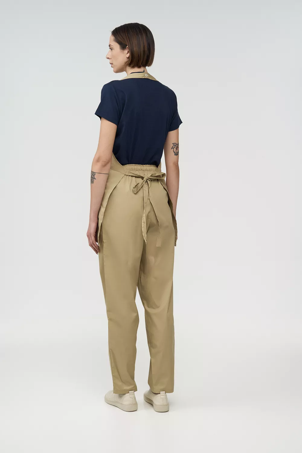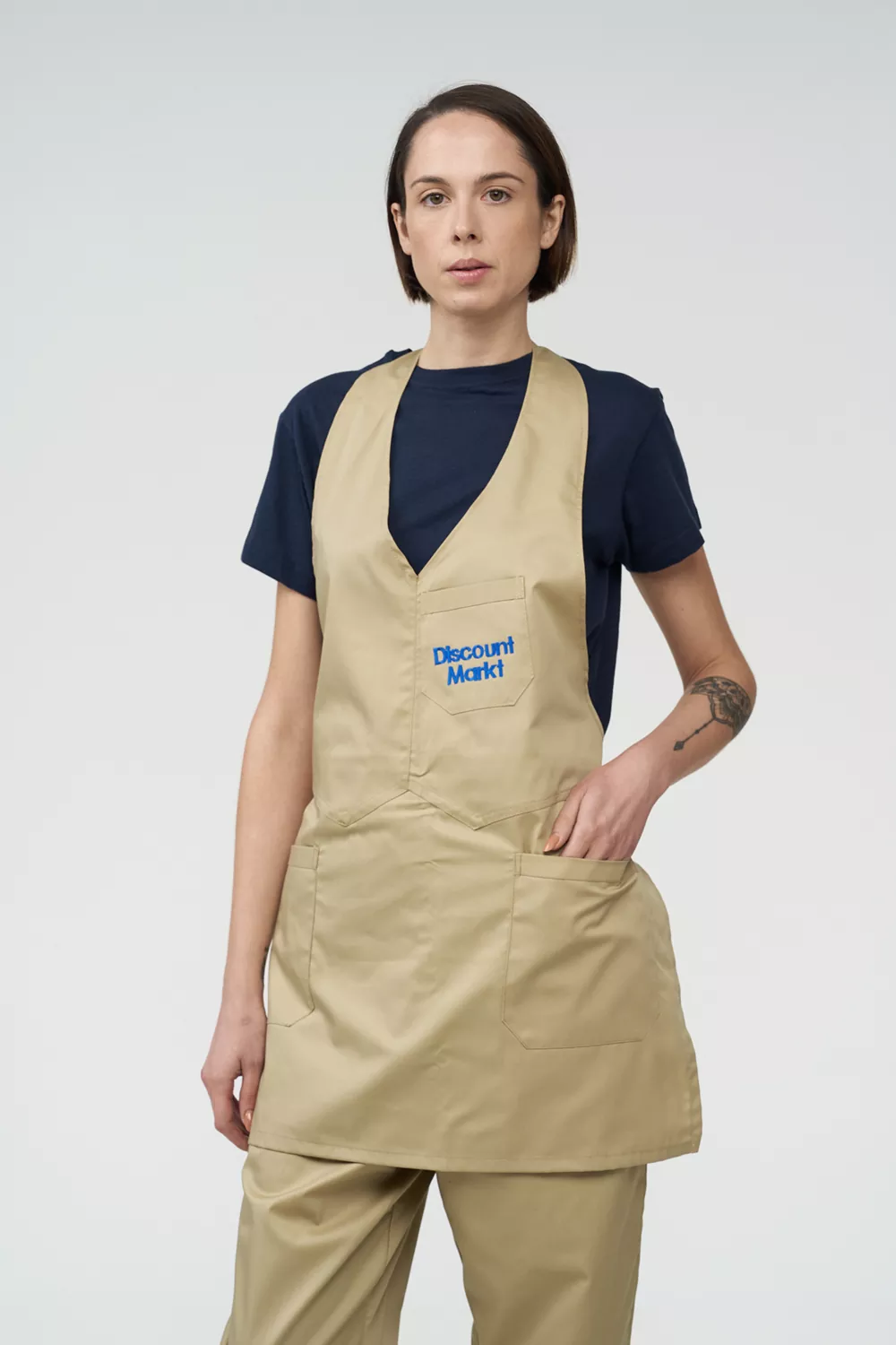 Το σετ περιλαμβάνει κοντομάνικο t-shirt και παντελόνι με ελαστική μέση και ρυθμιζόμενο κορδόνι, προσφέροντας άνετη εφαρμογή για διαφορετικούς σωματότυπους. Το σετ συνδυάζεται με δίτσεπη ποδιά γιλέκο, που προσφέρει επιπλέον πρακτικότητα και επαγγελματική εμφάνιση κατά τη διάρκεια της εργασίας.