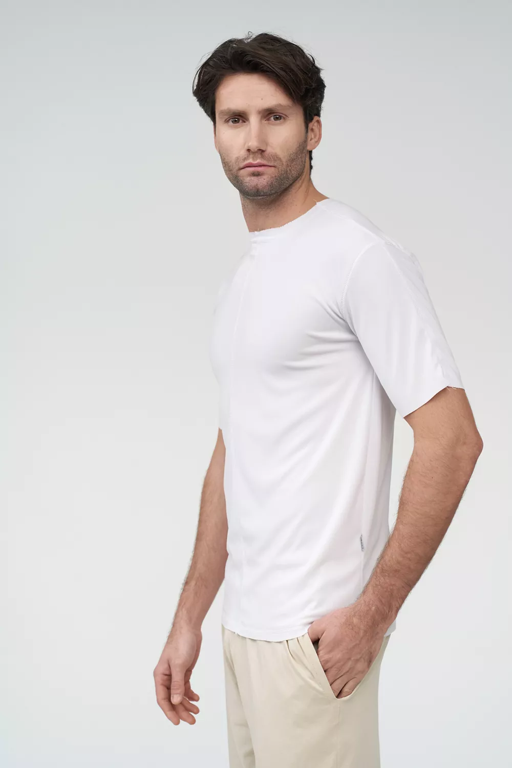 Το σετ περιλαμβάνει μοντέρνο κοντομάνικο t-shirt με εξωγαζά, προσφέροντας δροσερή και άνετη εμφάνιση κατά τη διάρκεια της εργασίας.