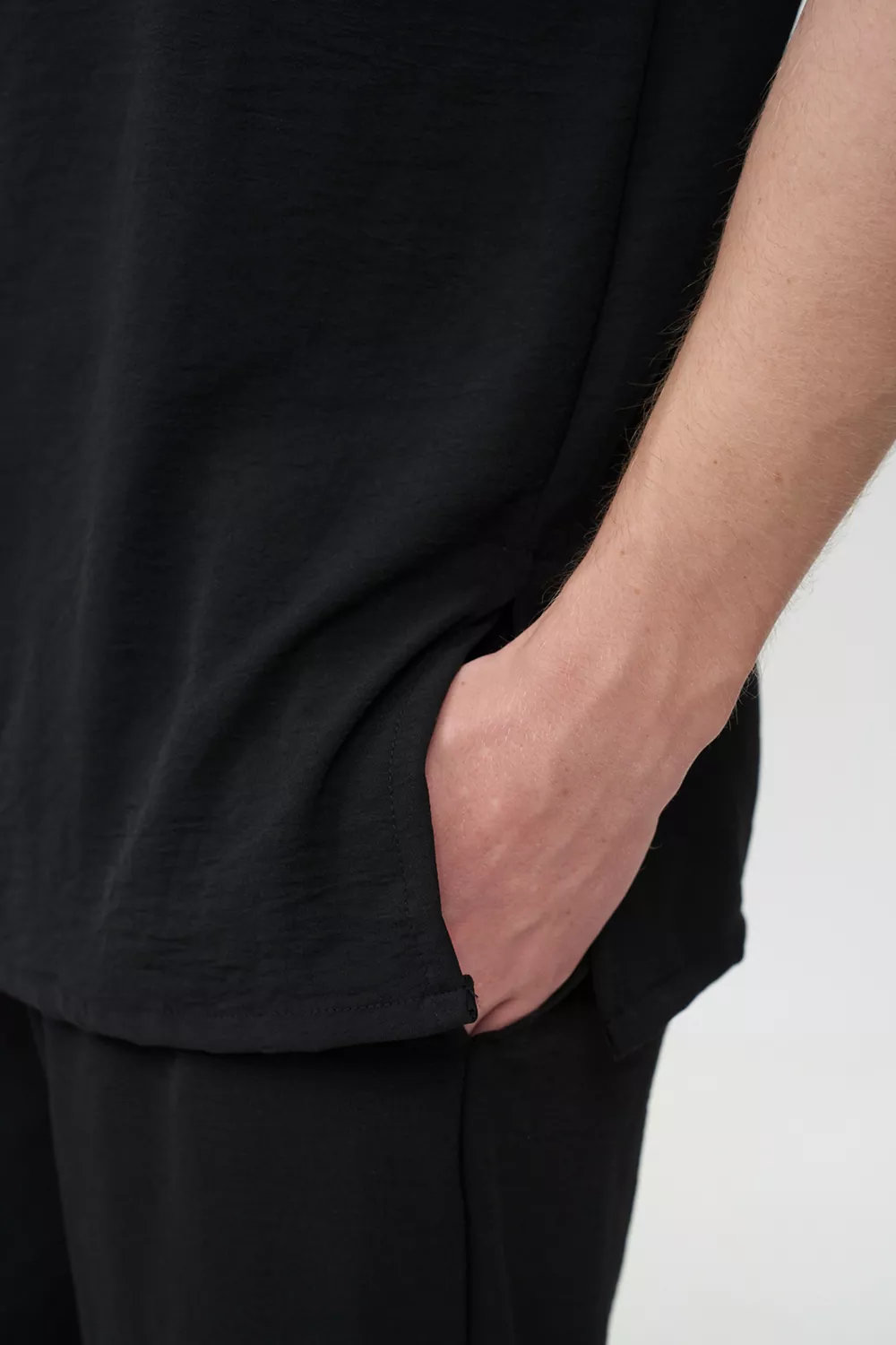 Το σετ περιλαμβάνει κοντομάνικη μπλούζα με σχισίματα στο πλάι και πατιλέτα εμπρός, προσφέροντας δροσερή, μοντέρνα και λειτουργική εμφάνιση.