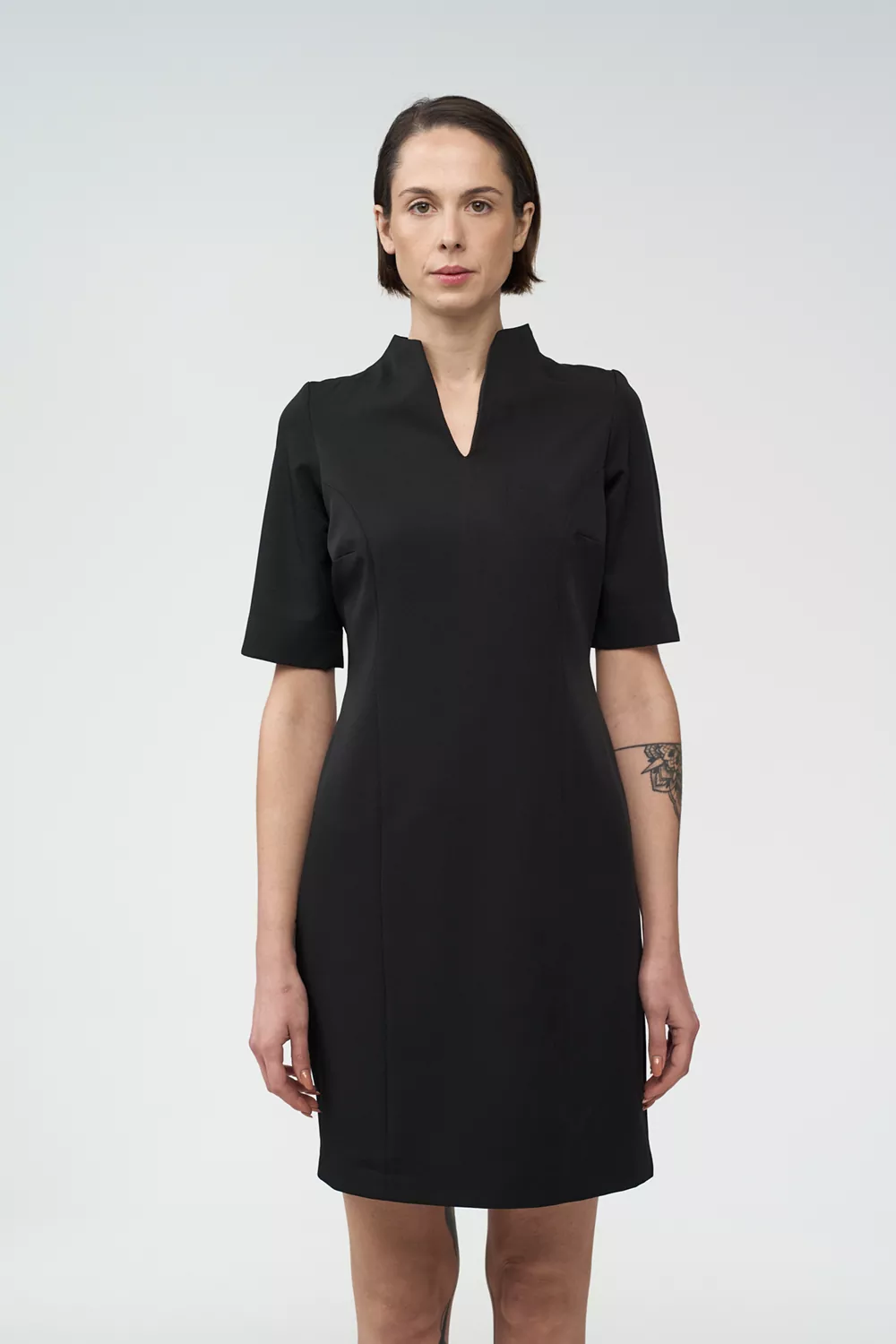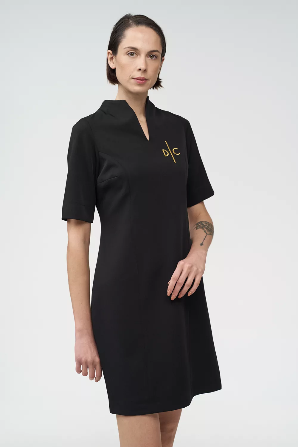 Το σετ περιλαμβάνει κοντομάνικο φόρεμα κομψού σχεδιασμού και μακρυμάνικο σακάκι με πέτο γιακά, προσφέροντας επαγγελματική και προσεγμένη εμφάνιση για προσωπικό υποδοχής.