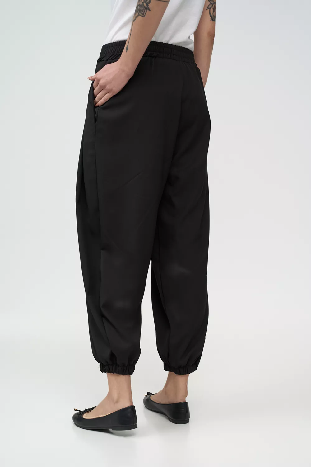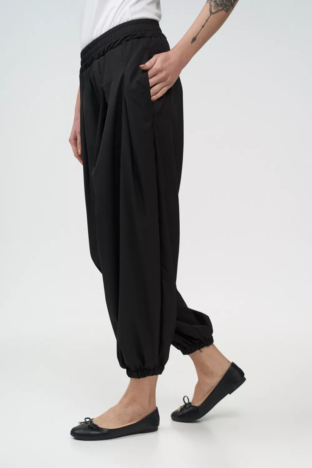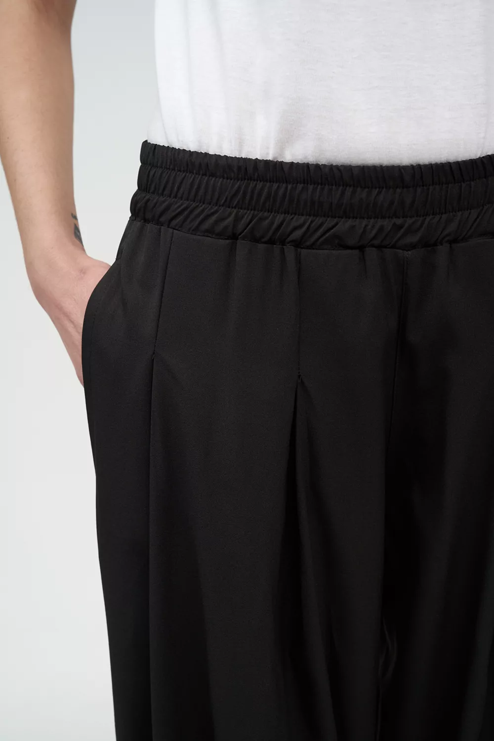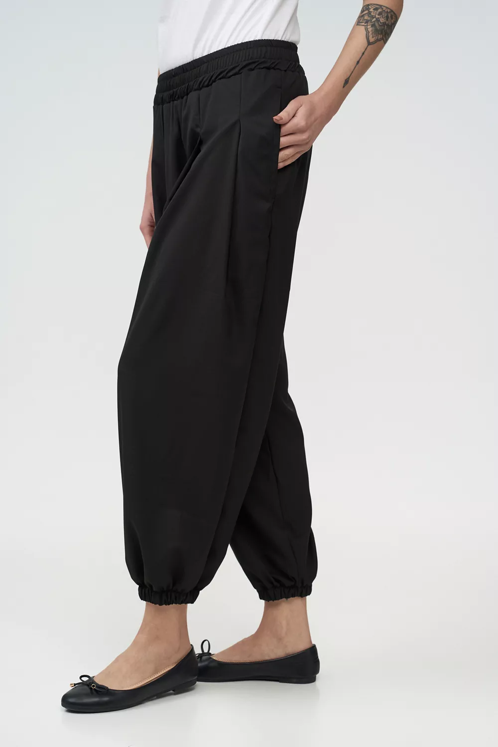 Το παντελόνι διαθέτει ελαστική μέση, πένσες και δύο τσέπες, εξασφαλίζοντας άνετη εφαρμογή και πρακτικότητα για προσωπικό υποδοχής με διαφορετικούς σωματότυπους.
