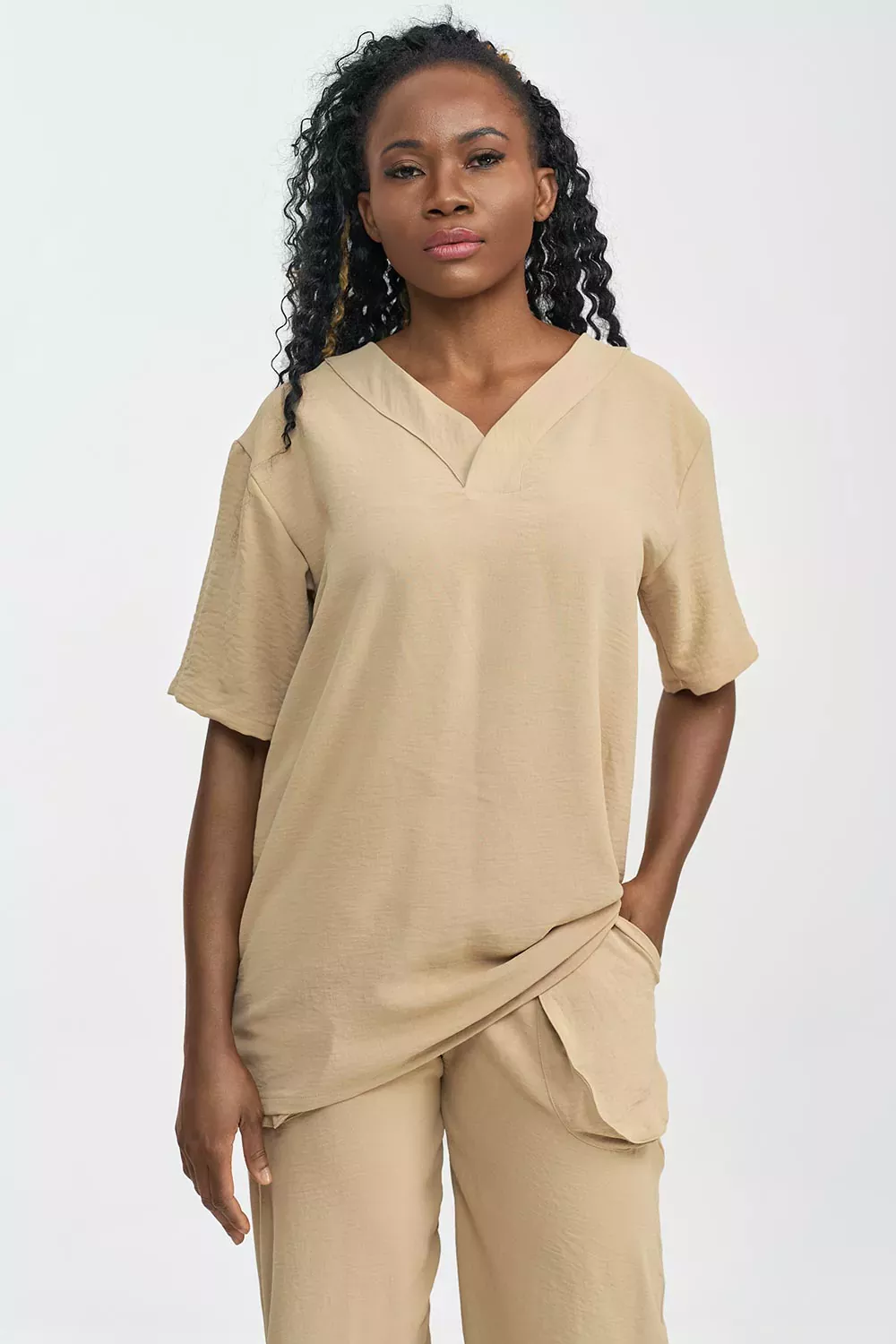 Σετ ρούχων unisex για beach bar, με κοντομάνικη μπλούζα με V-λαιμόκοψη ,για άνετη εφαρμογή και ελευθερία κινήσεων. Το παντελόνι διαθέτει λάστιχο στη μέση για να προσαρμόζεται σε πολλούς σωματότυπους και εξωτερικές τσέπες για πρακτική χρήση κατά την εργασία.